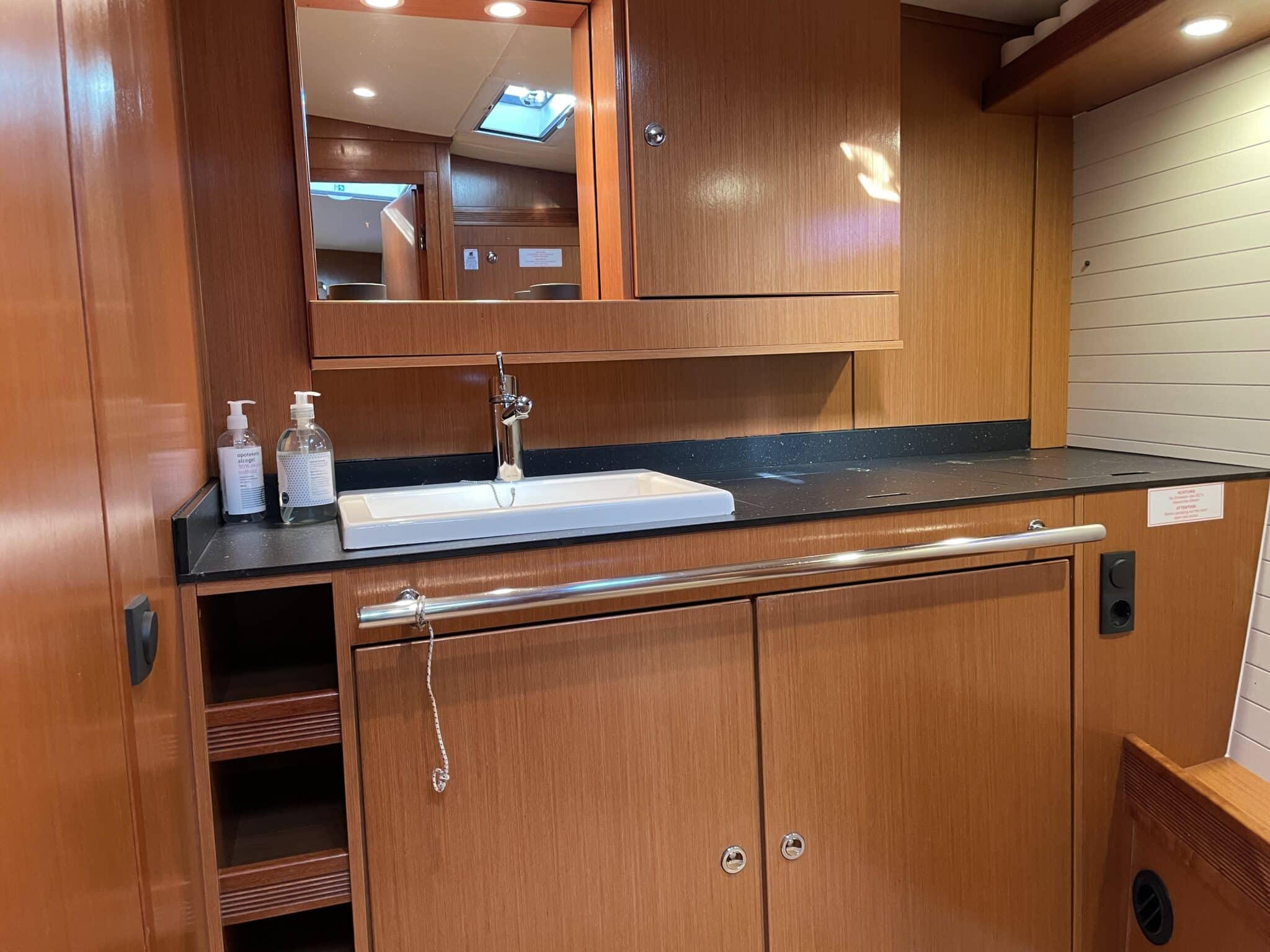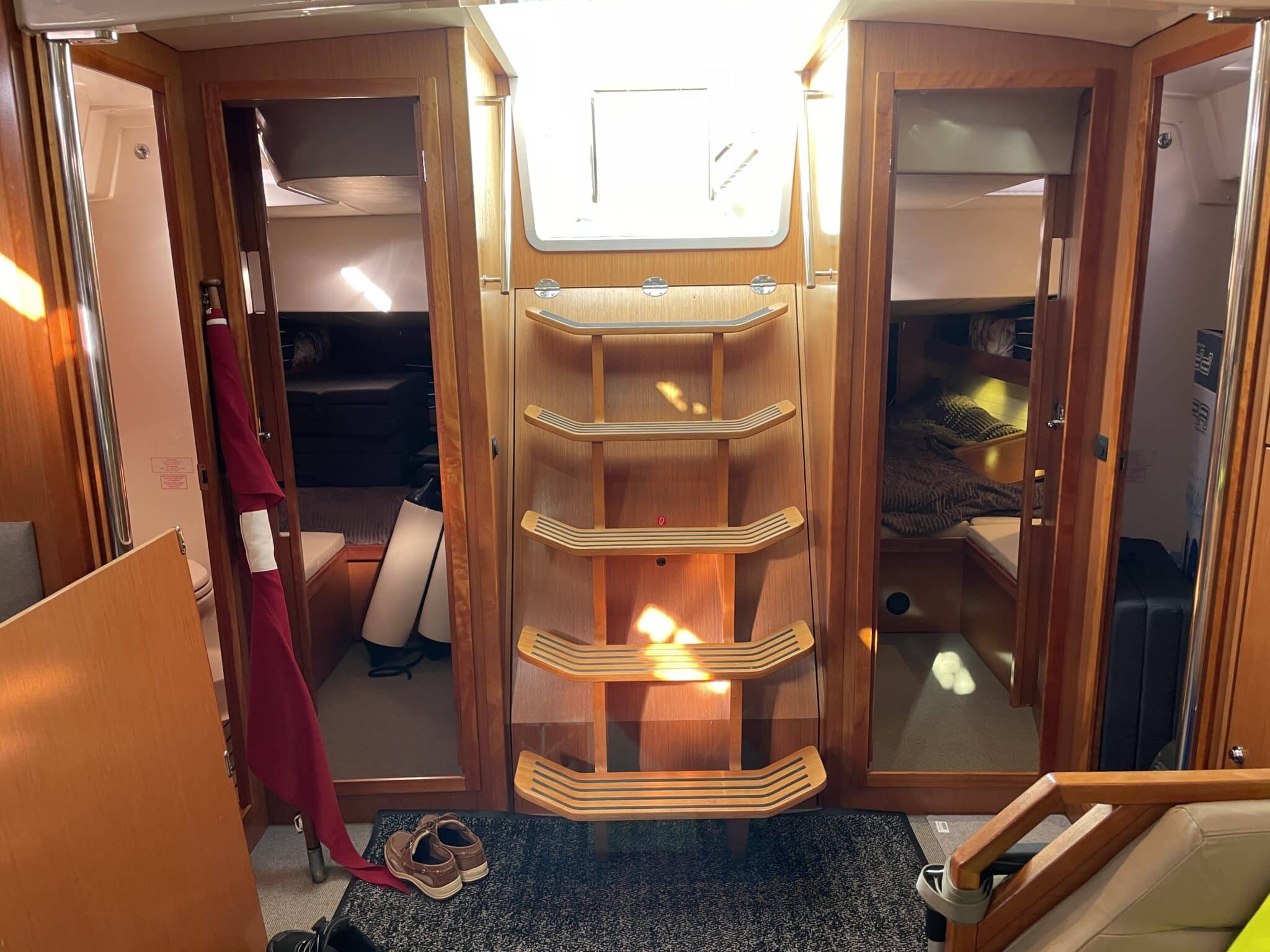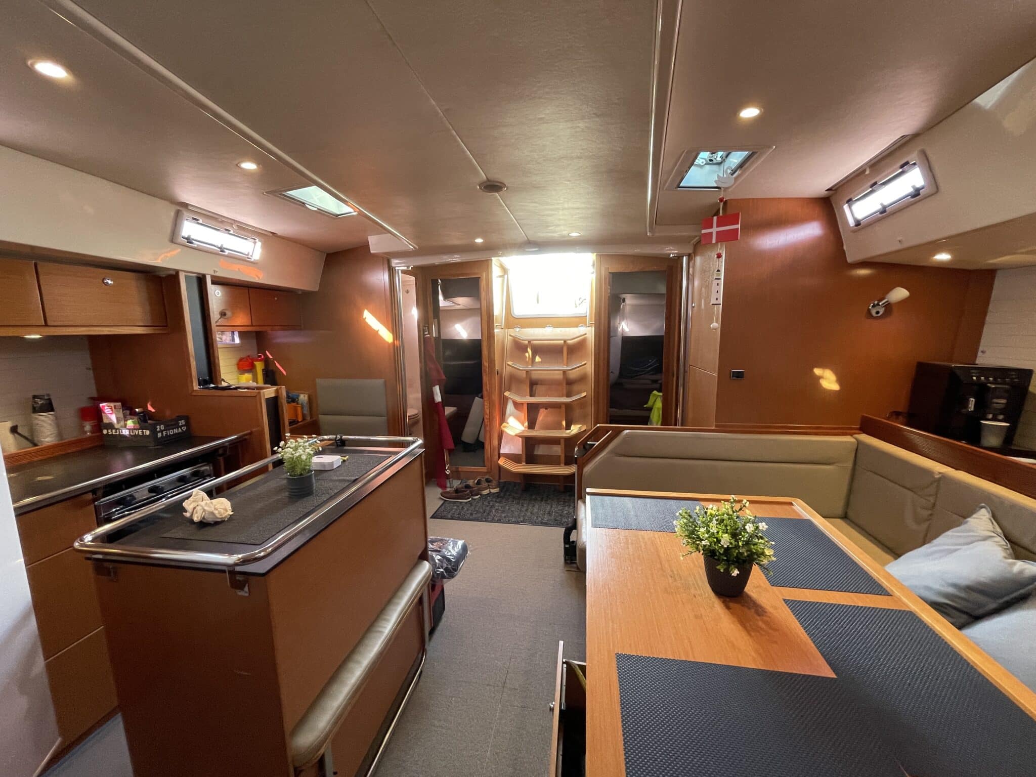 Flot design med fokus på funktionelt. Godt disponeret med de 3 kahytter med eget toilet, rummelig salon, højt til loftet – 210 cm.