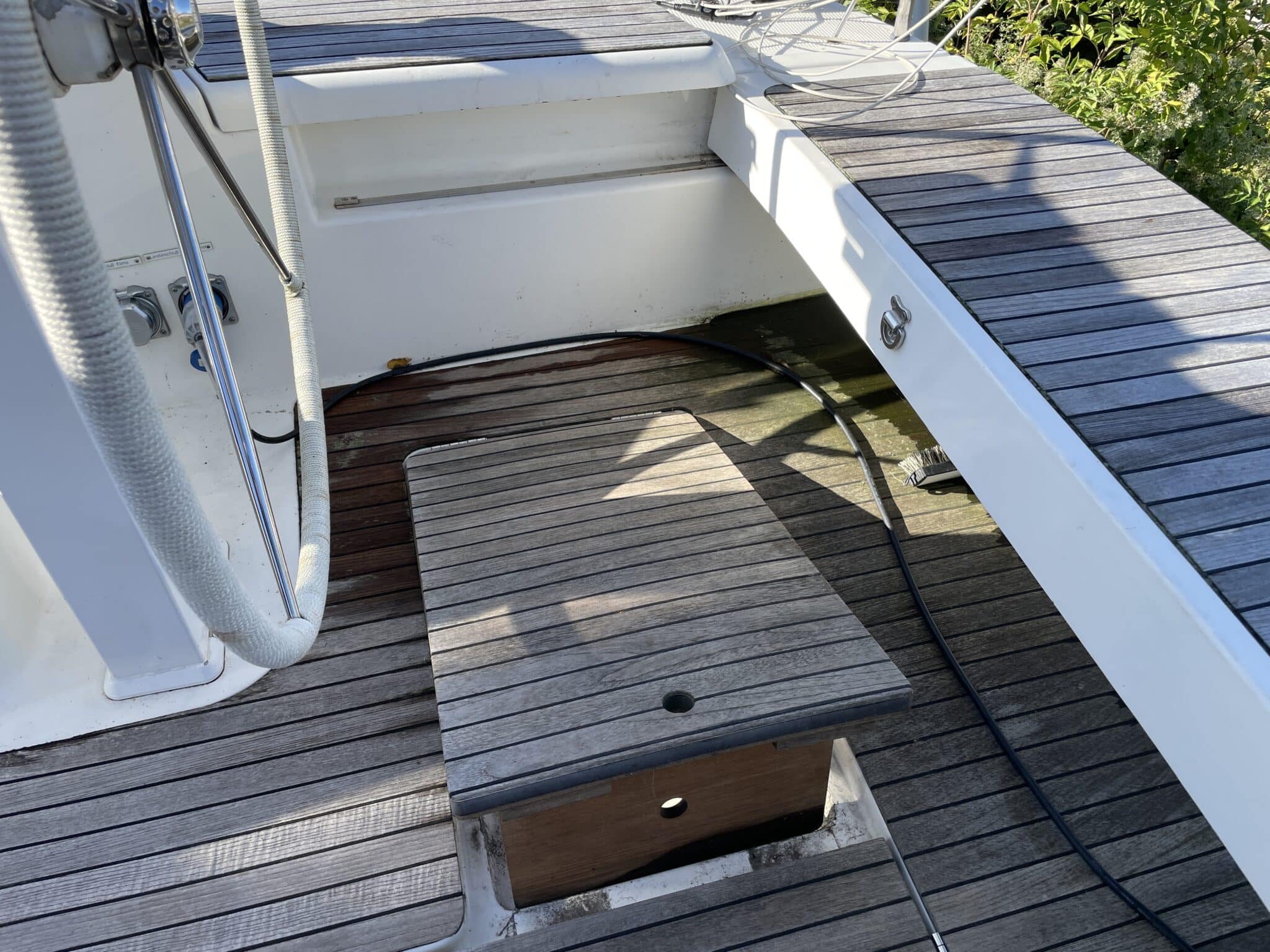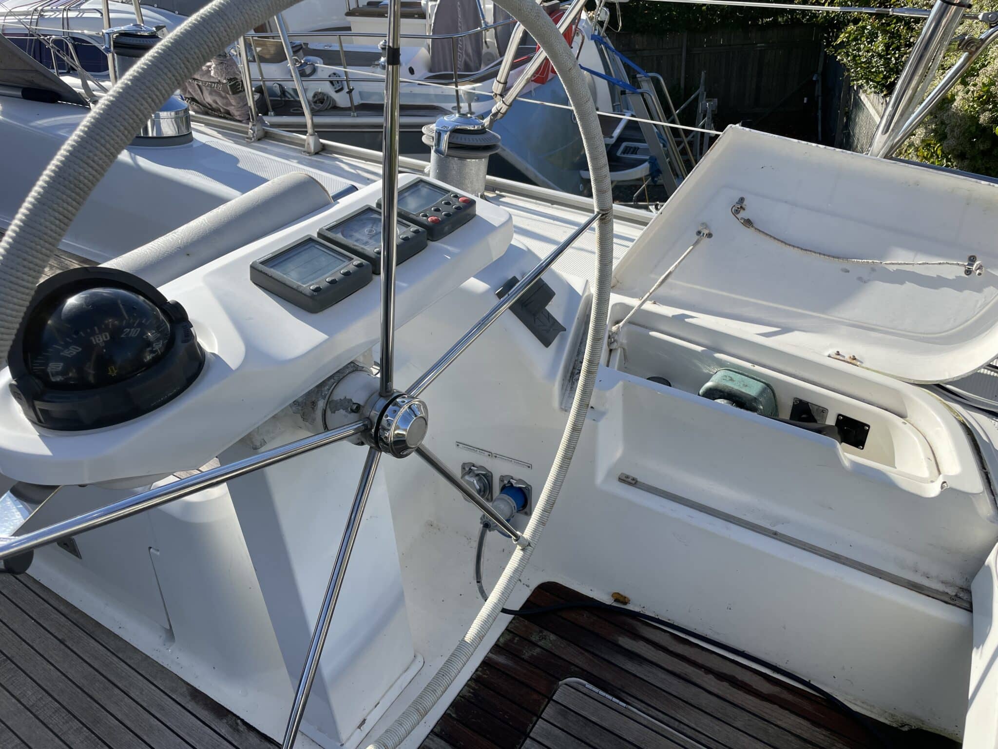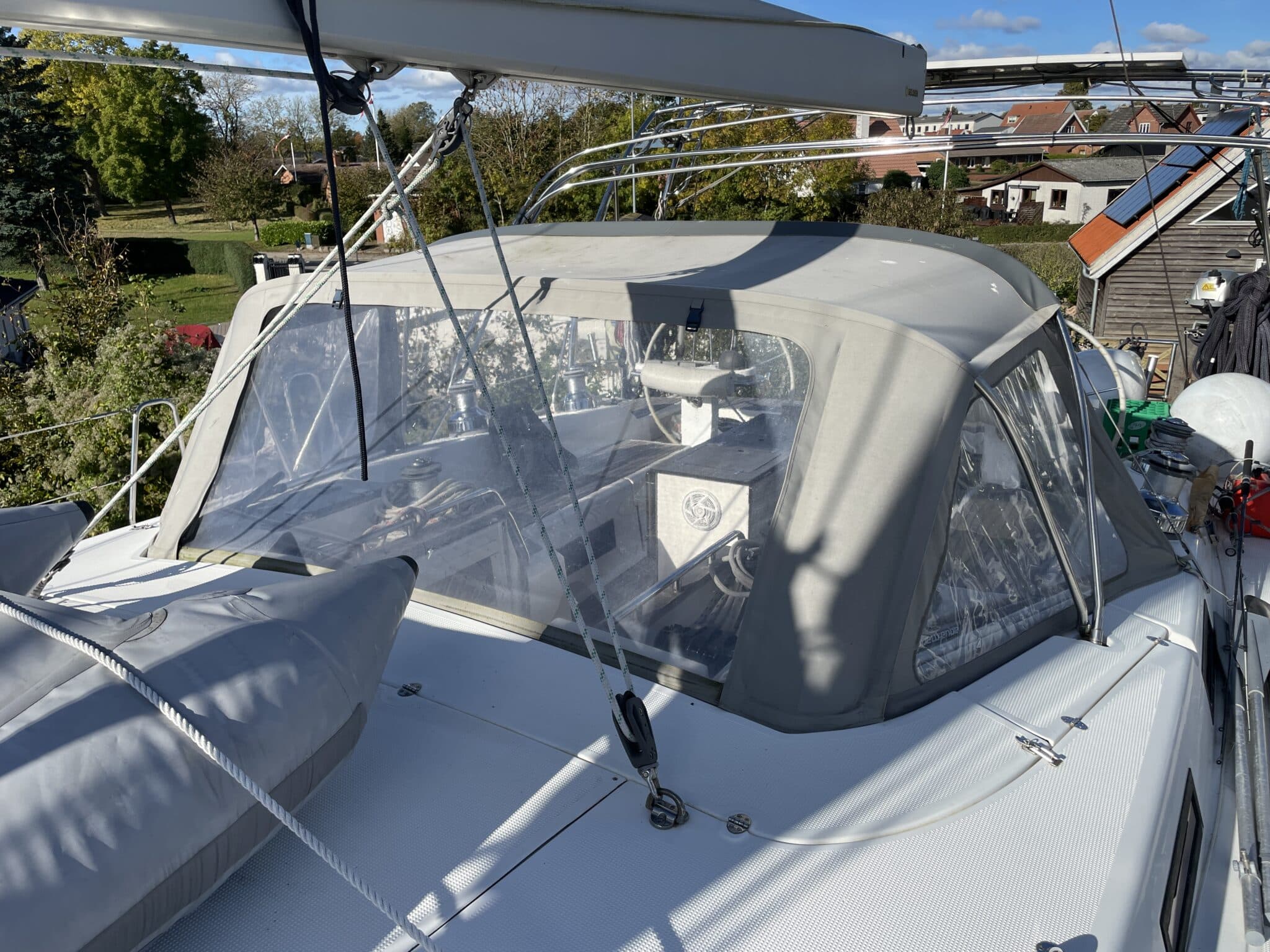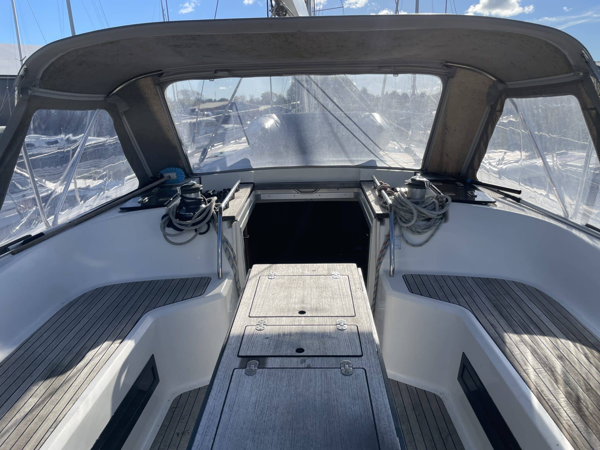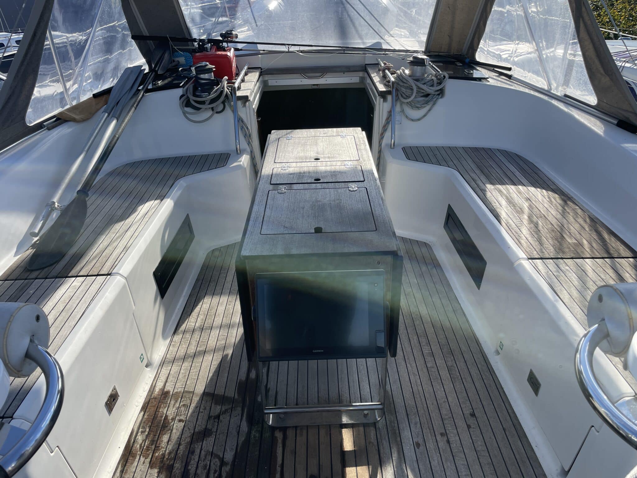 Cockpit med siddepladser i begge sider, fast bord deer kan klappes ud, bænk bagerst som kan rykkes frem/tilbage. Ialt siddepladser til 10 – 12 personer. 2 x rat styring, med betjening af motor, truster og ankerspil i SB side. Sprayhood samt Bemini. Agterspejl kan sænkes badeplatform og via trappe til den er der adgang til garagen under cockpit – her er plads til gummibåd og andet udstyr. Agter er solceller placeret på bøjler med davider.
