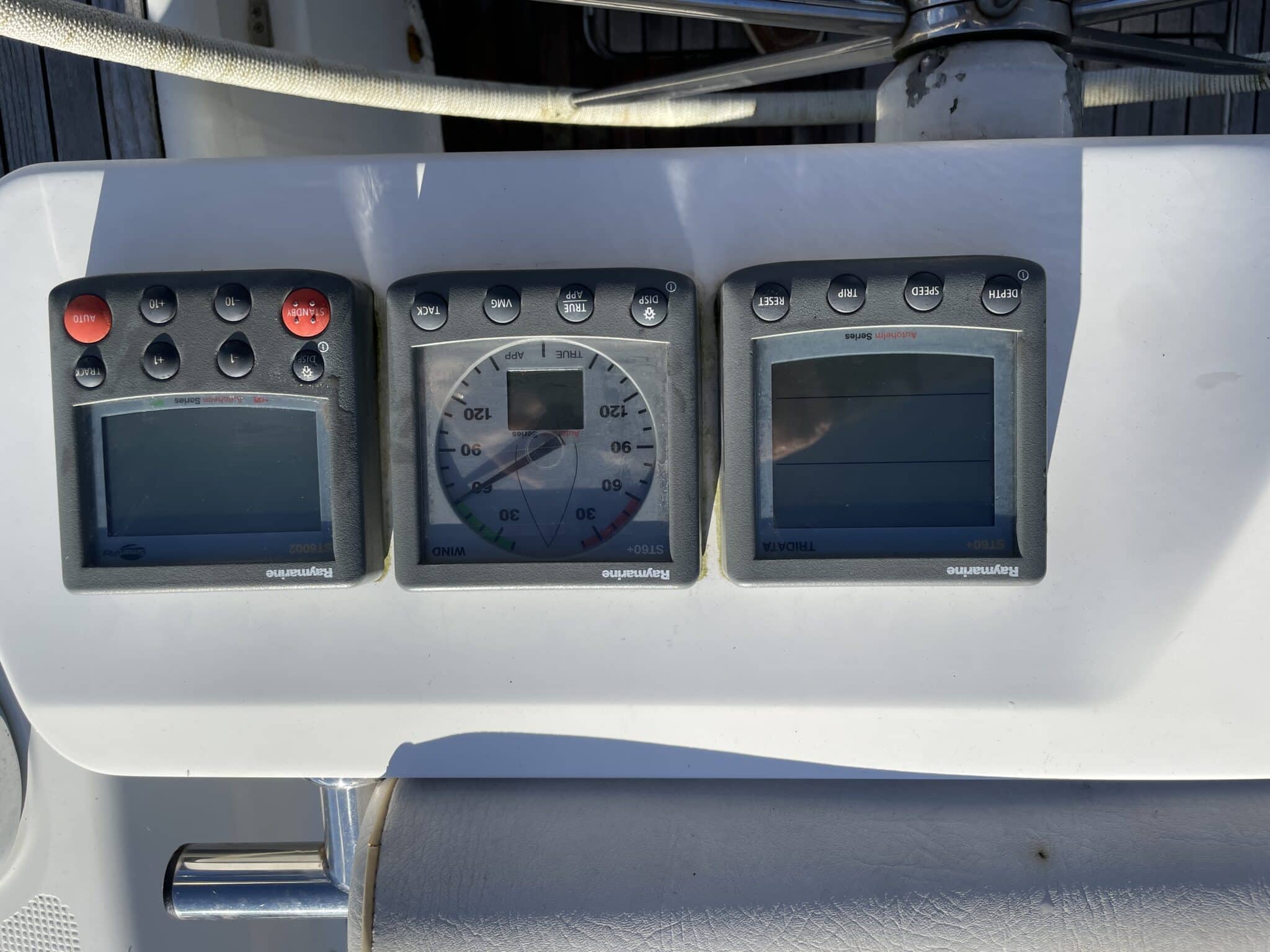 Raytheon autopilot, vindinstrument. VHF fra 2020, AIS sender og modtager. Lod og log fra Raymarine. Garmin GPS/plotter.
