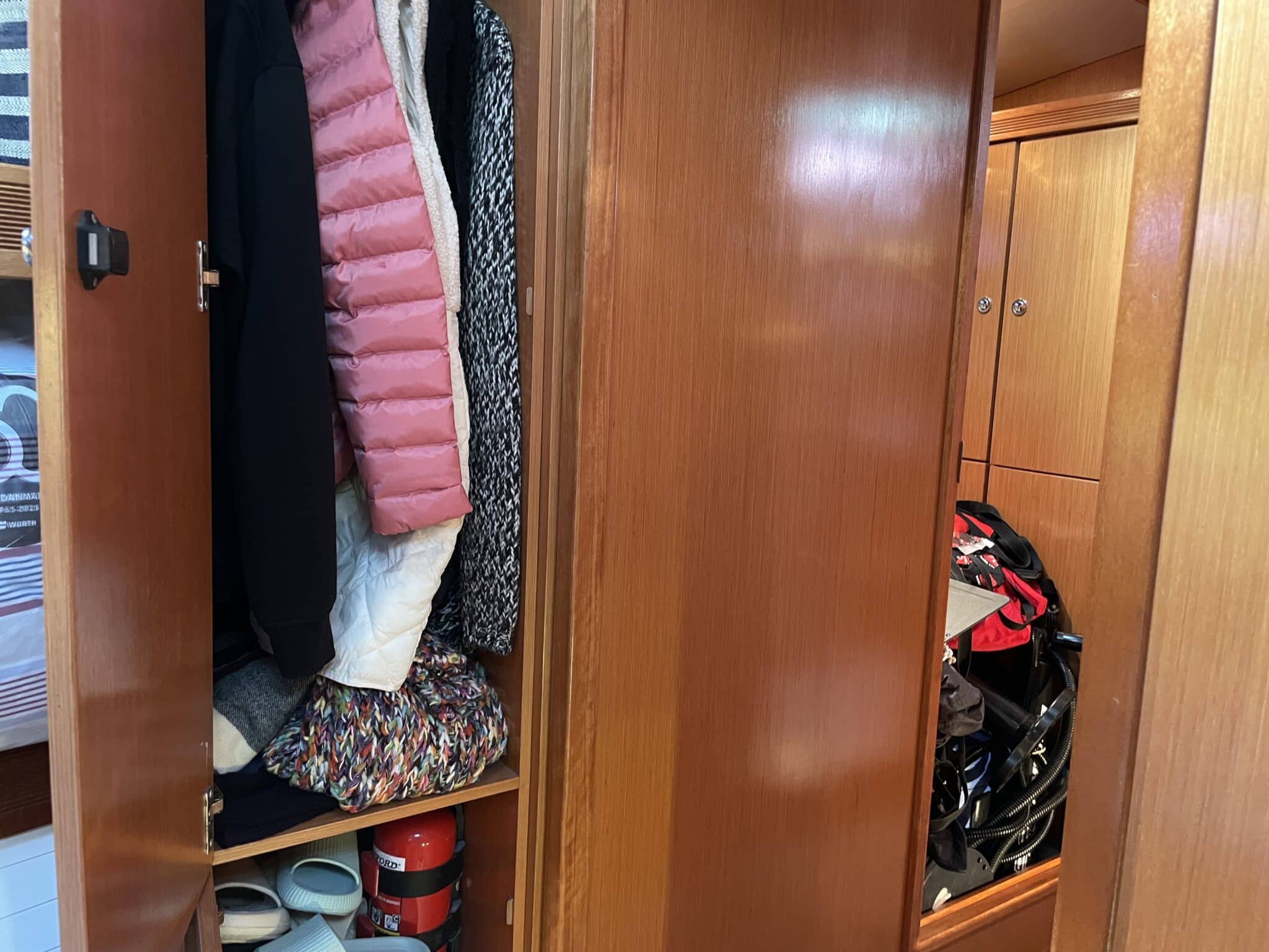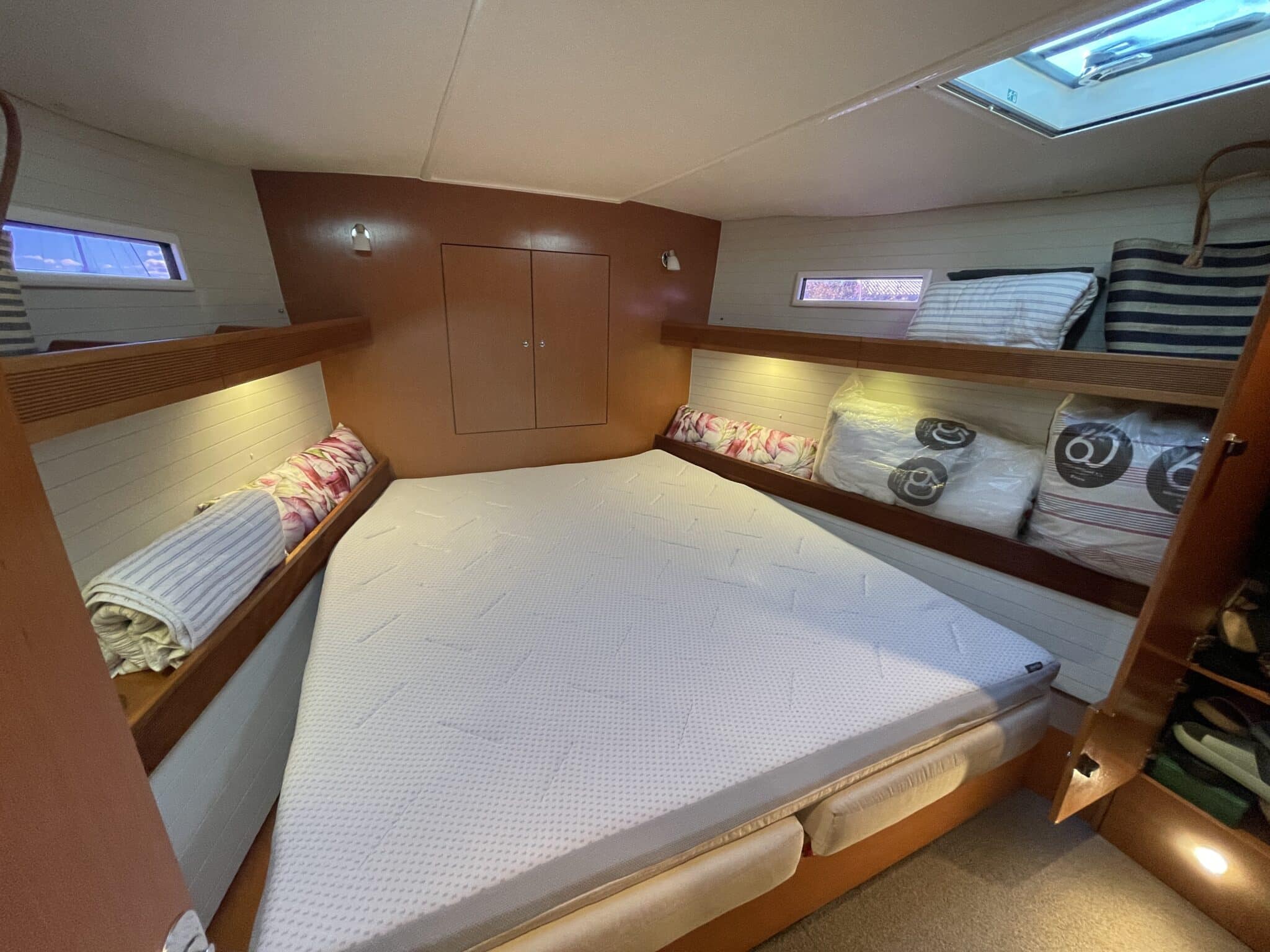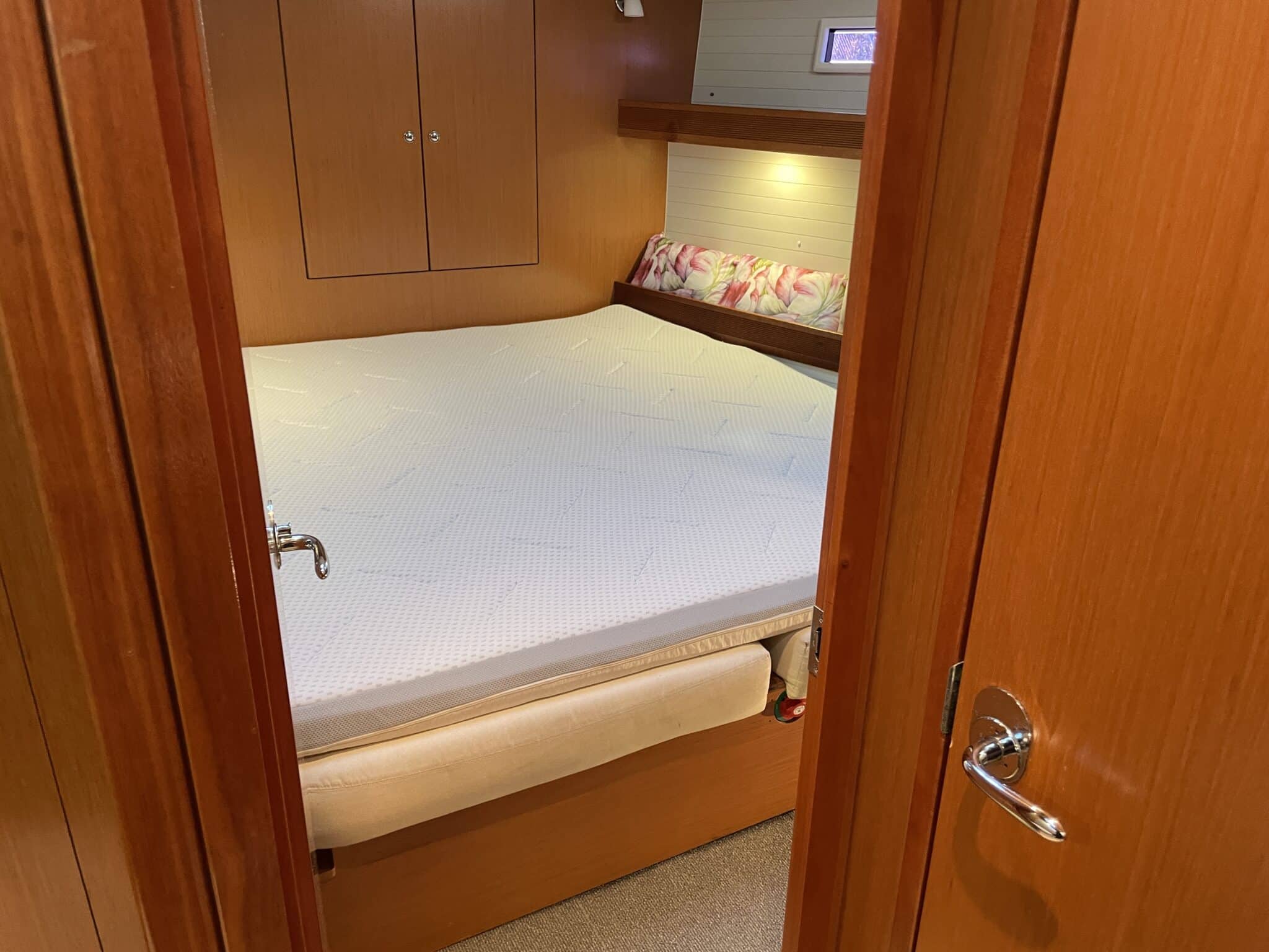 Adgang til Master cabin, i stævnen med stor dobbelt seng, skabsplads helt i front og højskabe samt hylder. Toiletrum med flot arrangement og separat brusekabine. Depotrum i SB side i kombination med skabsplads, eller kan indrettes til kahyt.