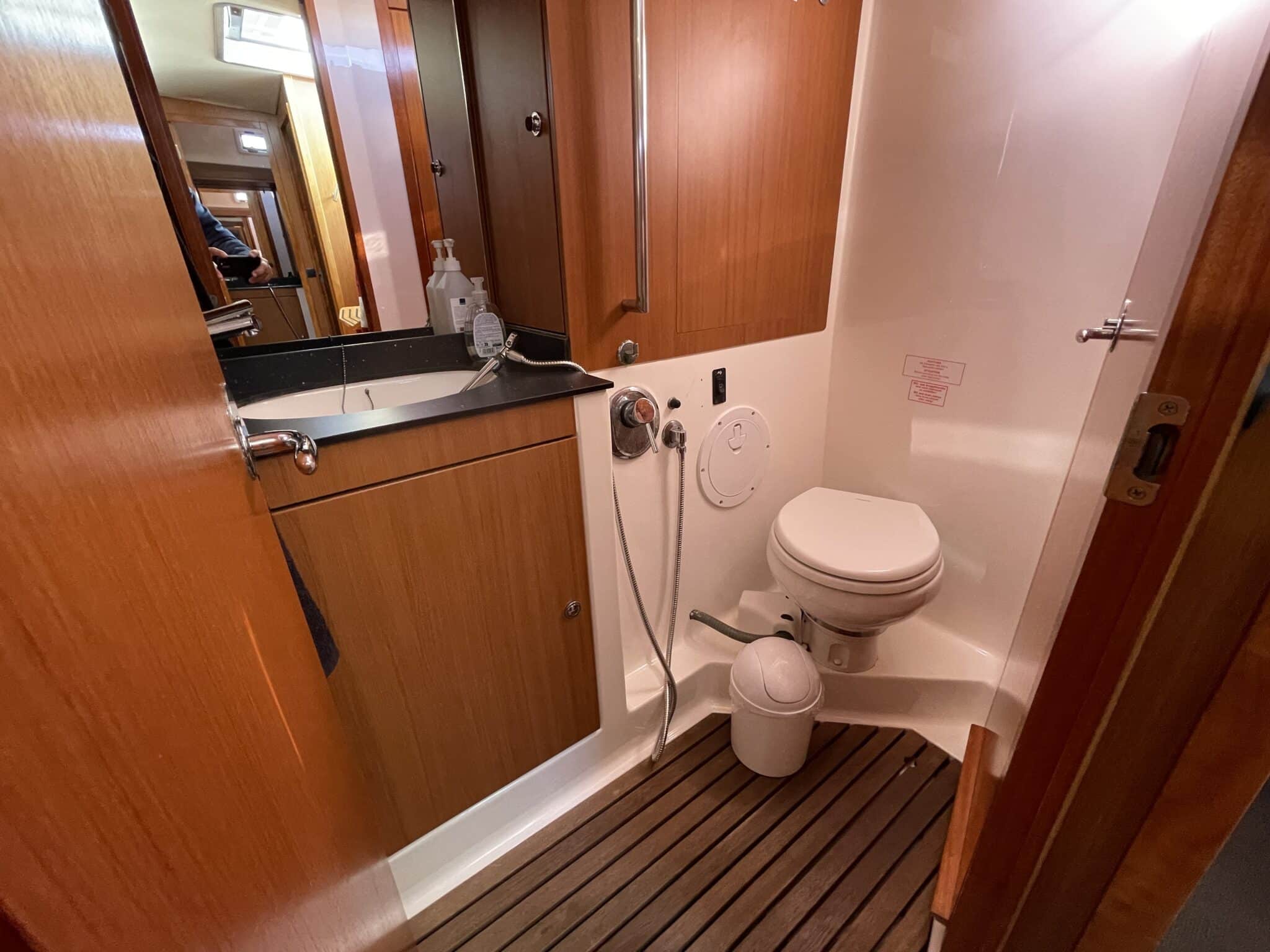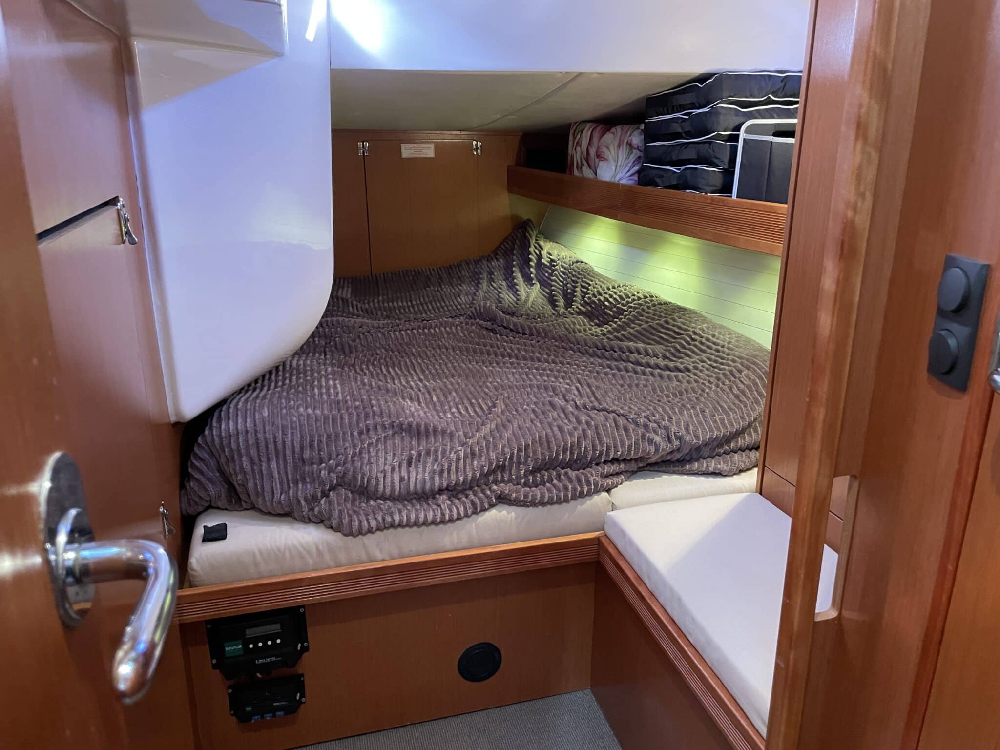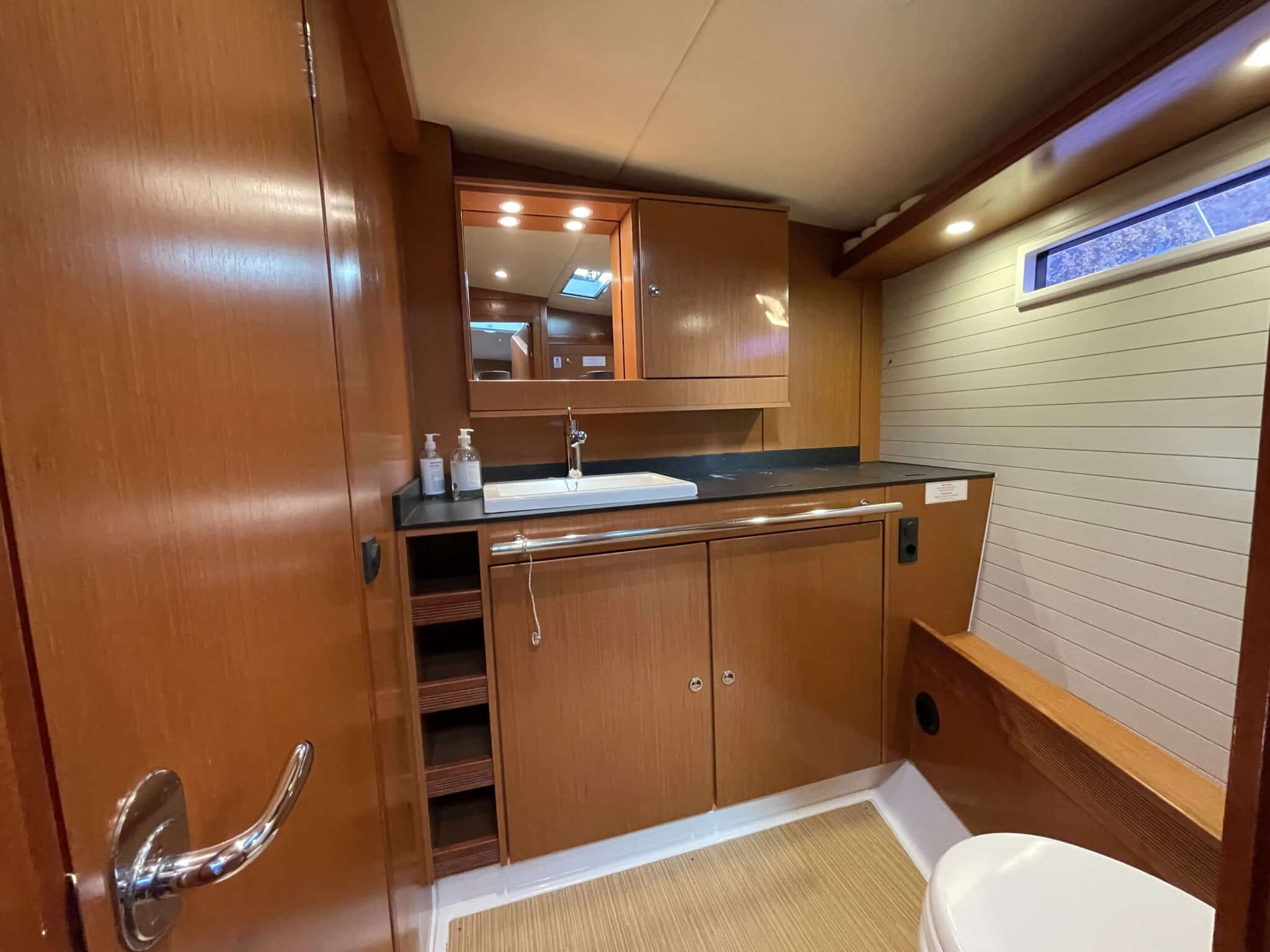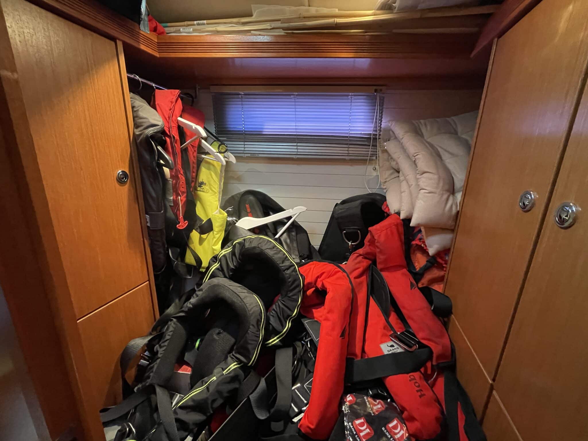 Adgang til Master cabin, i stævnen med stor dobbelt seng, skabsplads helt i front og højskabe samt hylder. Toiletrum med flot arrangement og separat brusekabine. Depotrum i SB side i kombination med skabsplads, eller kan indrettes til kahyt.