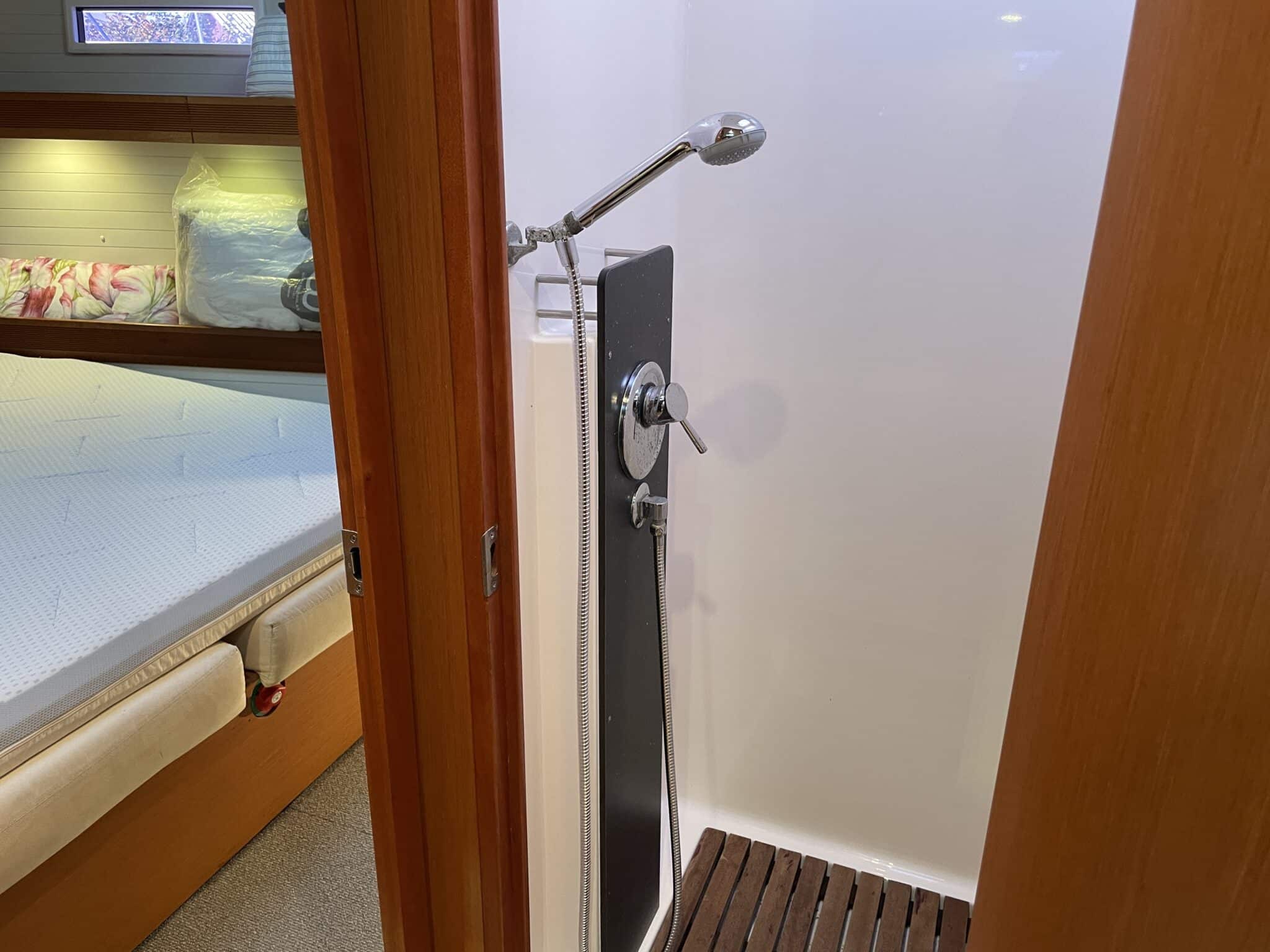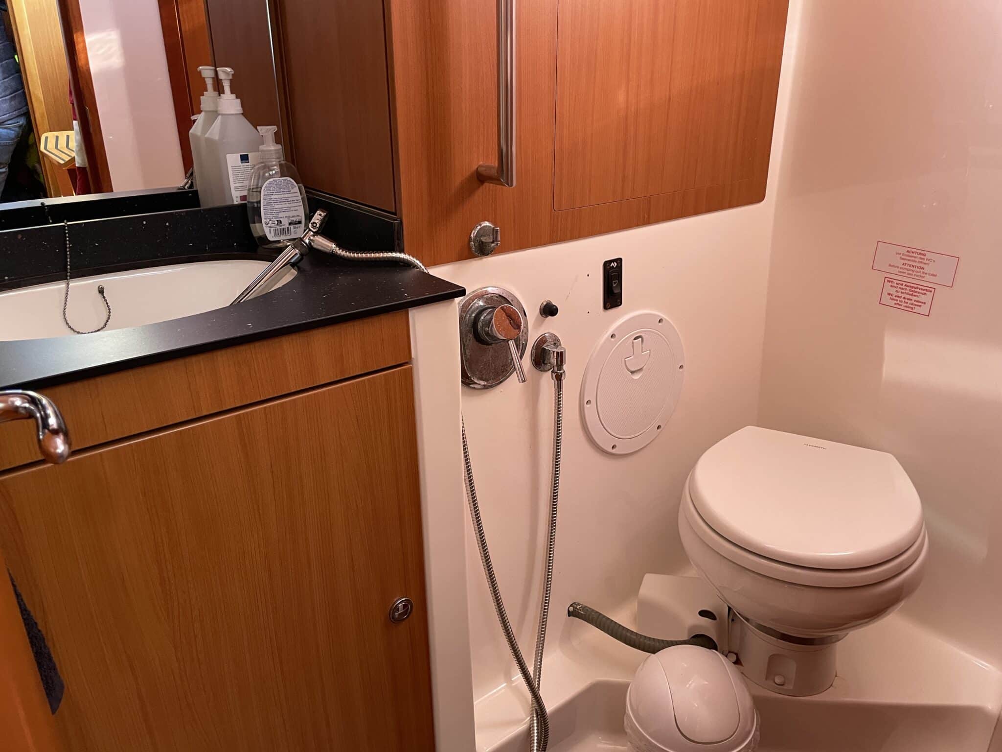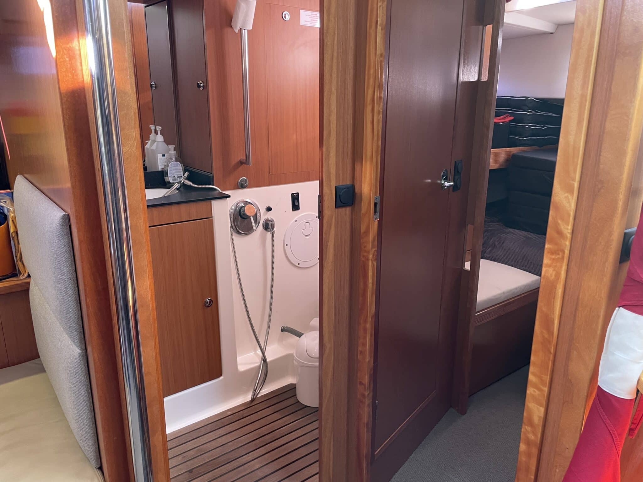 Salon med god udnyttelse og plads til mange personer ombord. Agter kahytter i begge sider med hver sit Toiletrum toilet koblet til holding tank, brusebad og skabsplads samt dobbeltseng.