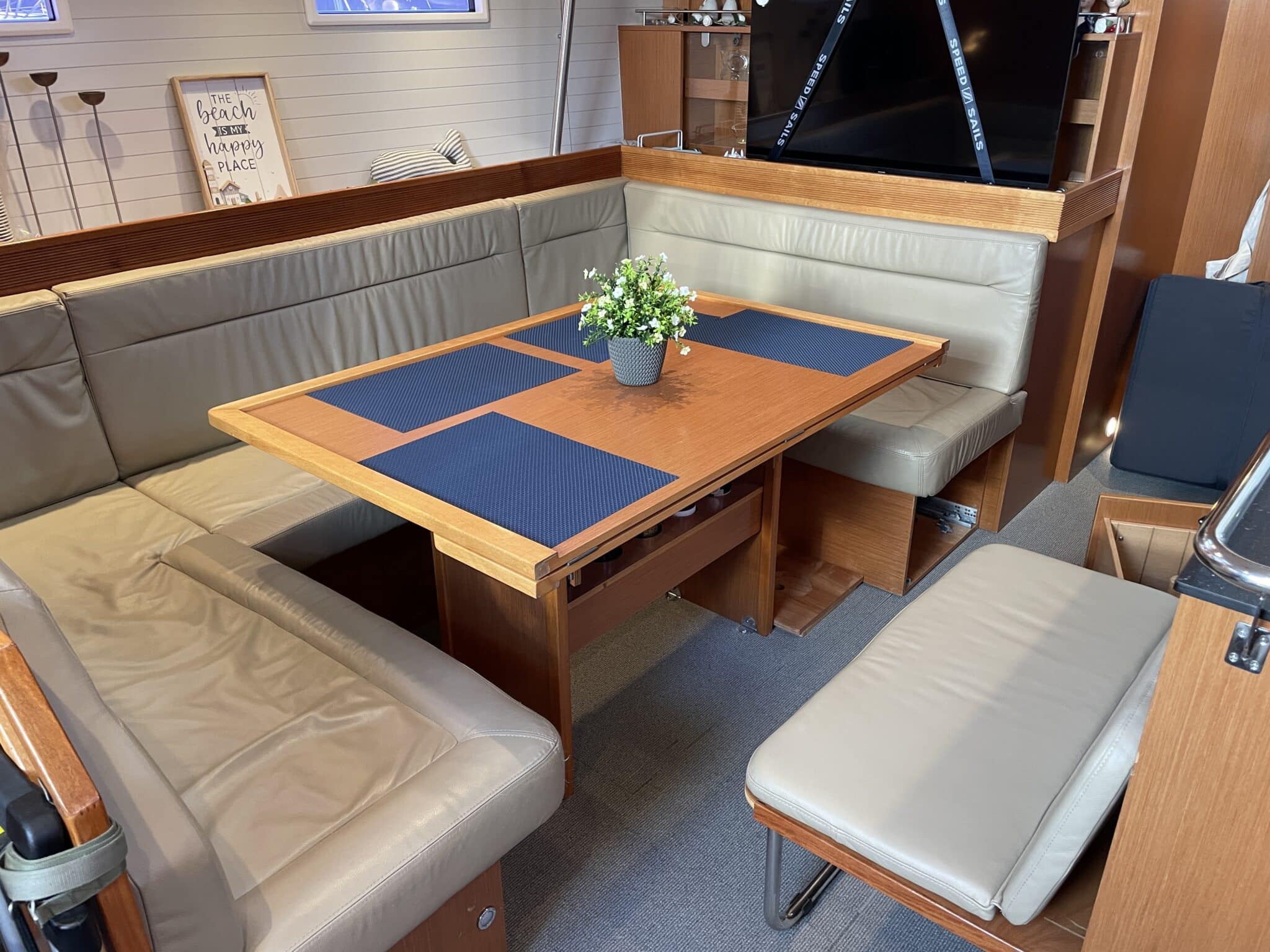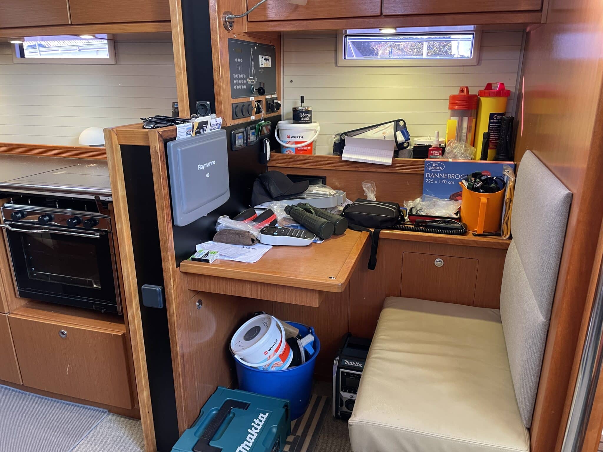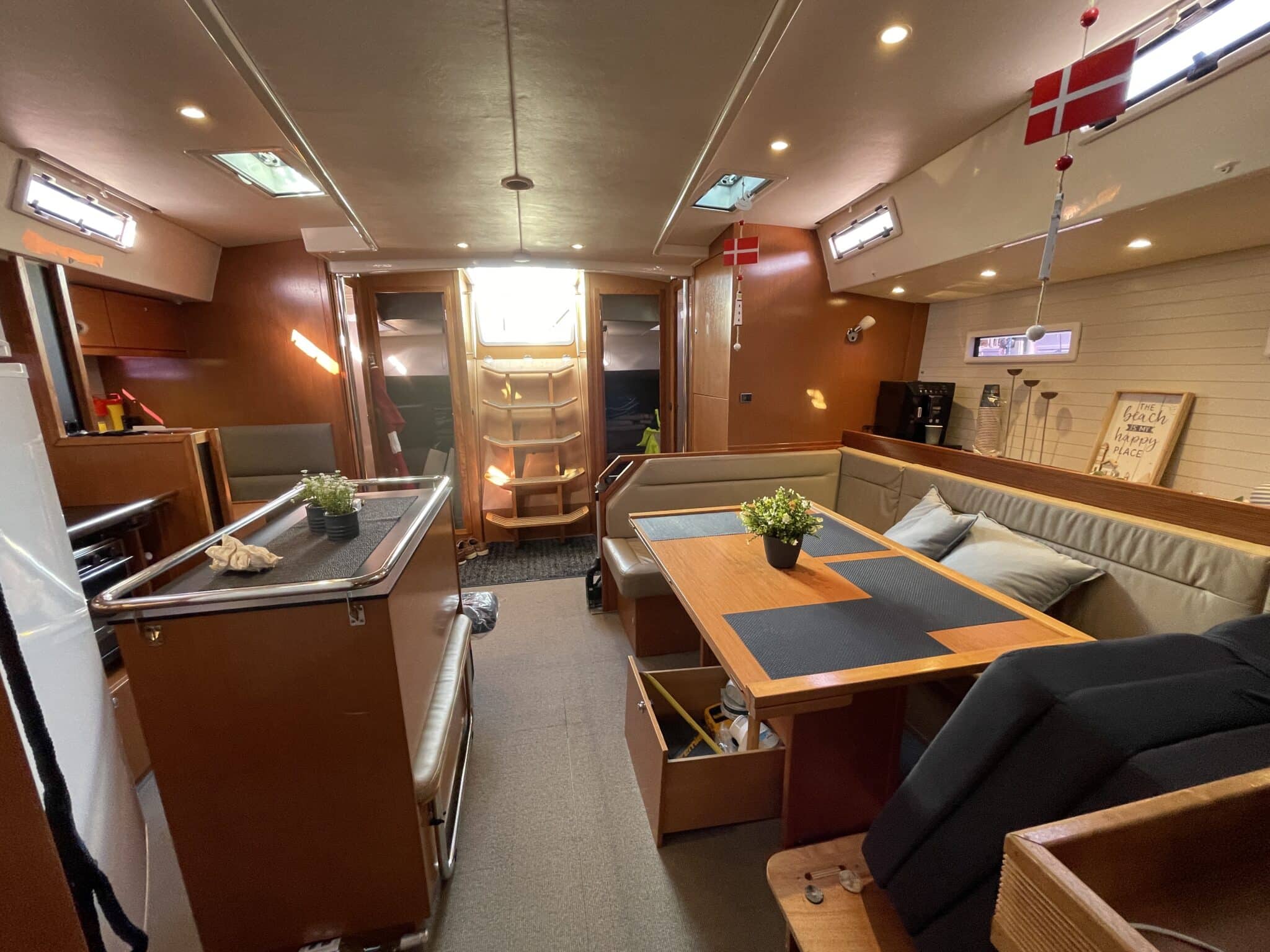 Navigations plads i SB side. Stor U-formet siddegruppe i BB side, med lyst læder på sofa, stort bord der kan klappes ud, sofa med depotrum kan trækkes ud fra skab med bordplade, der skiller siddegruppe fra pantry. Pantry med db vask, koldt og varmt vand, køleboks med ny kompressor, GRAM frost/køl, Eno komfur/ovn, mange skabe og hylder.