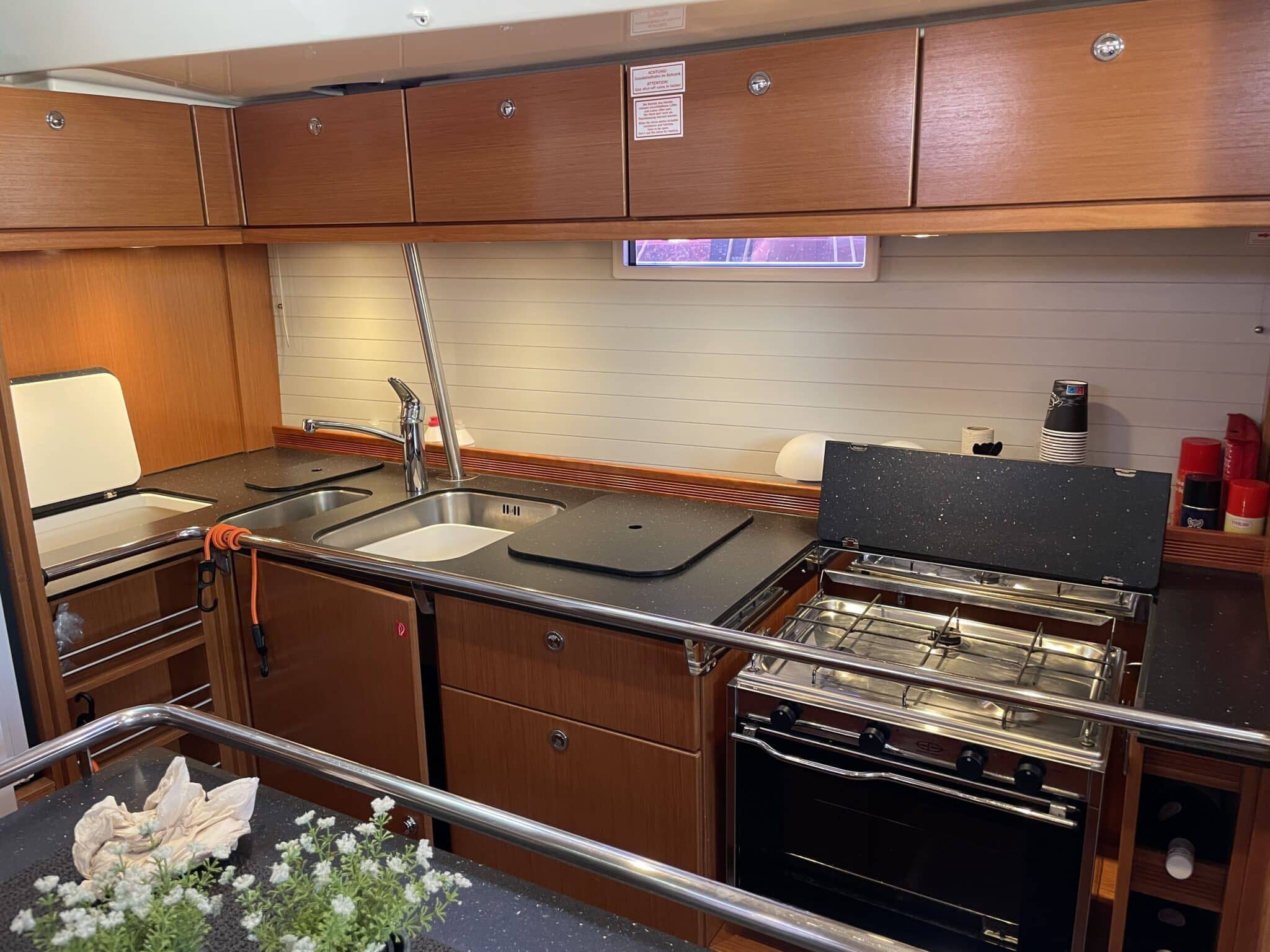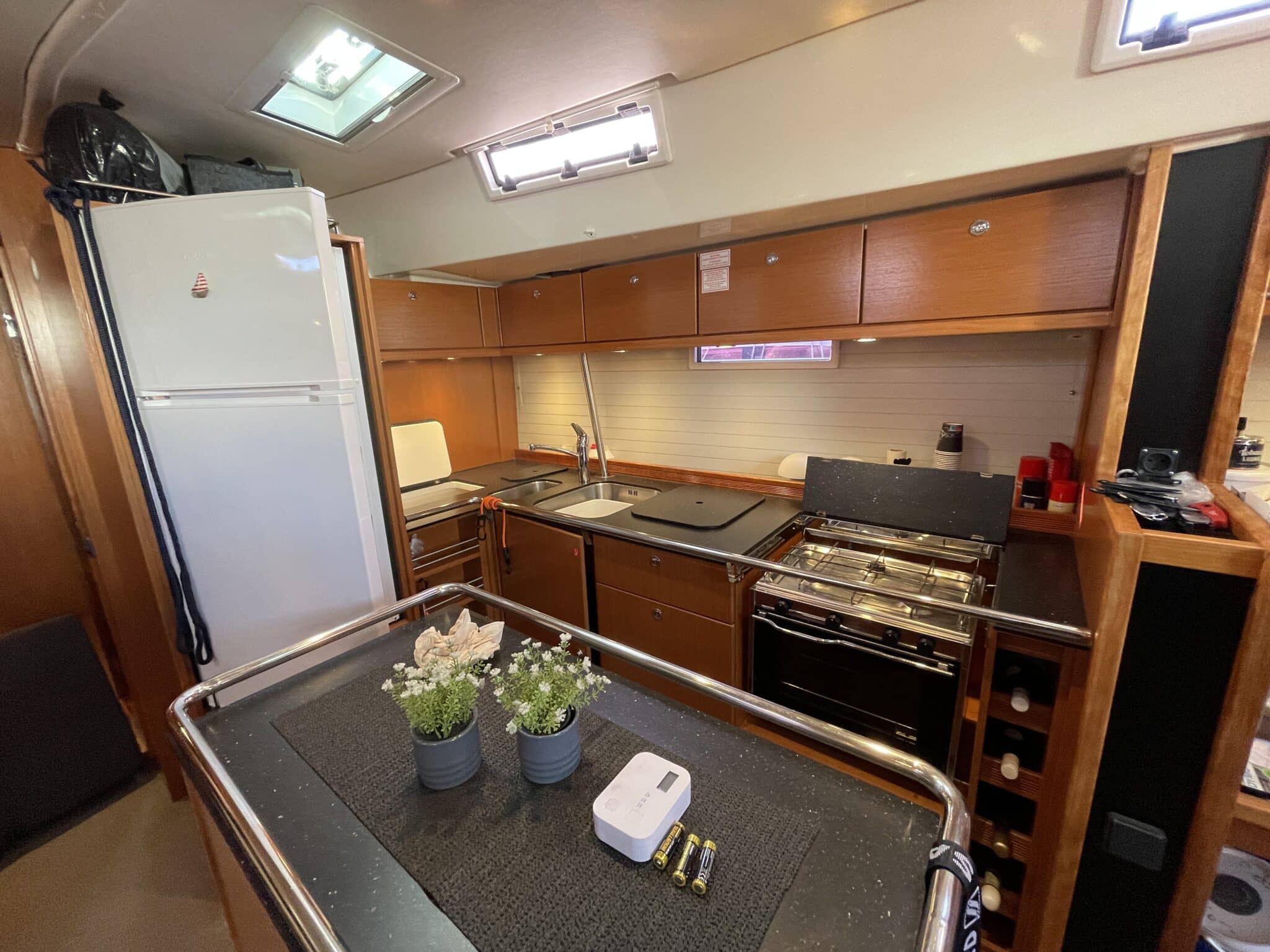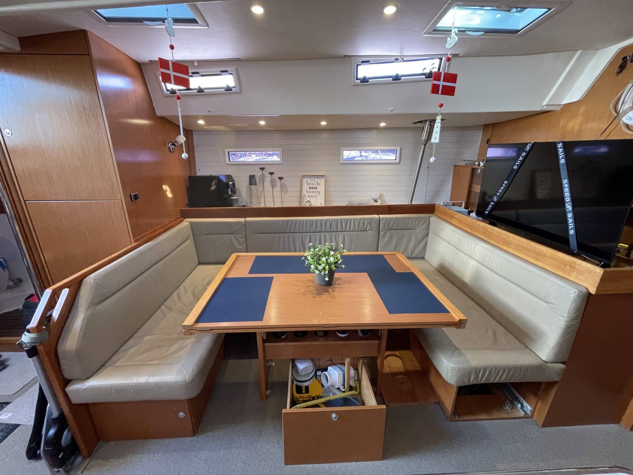 Navigations plads i SB side. Stor U-formet siddegruppe i BB side, med lyst læder på sofa, stort bord der kan klappes ud, sofa med depotrum kan trækkes ud fra skab med bordplade, der skiller siddegruppe fra pantry. Pantry med db vask, koldt og varmt vand, køleboks med ny kompressor, GRAM frost/køl, Eno komfur/ovn, mange skabe og hylder.