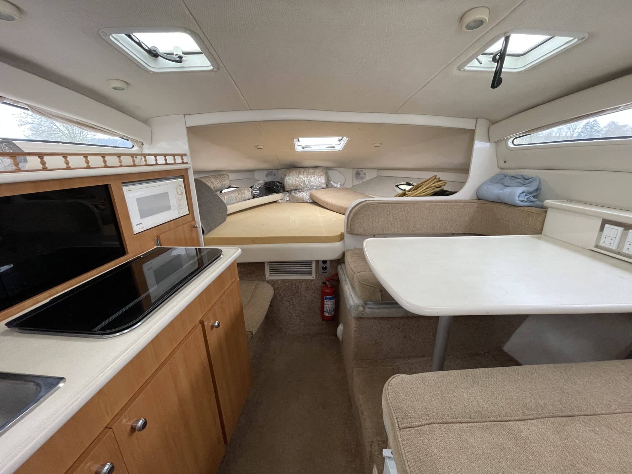 Kahyt med Pantry i BB side, vask, mikroovn, 2 blus og køleskab.