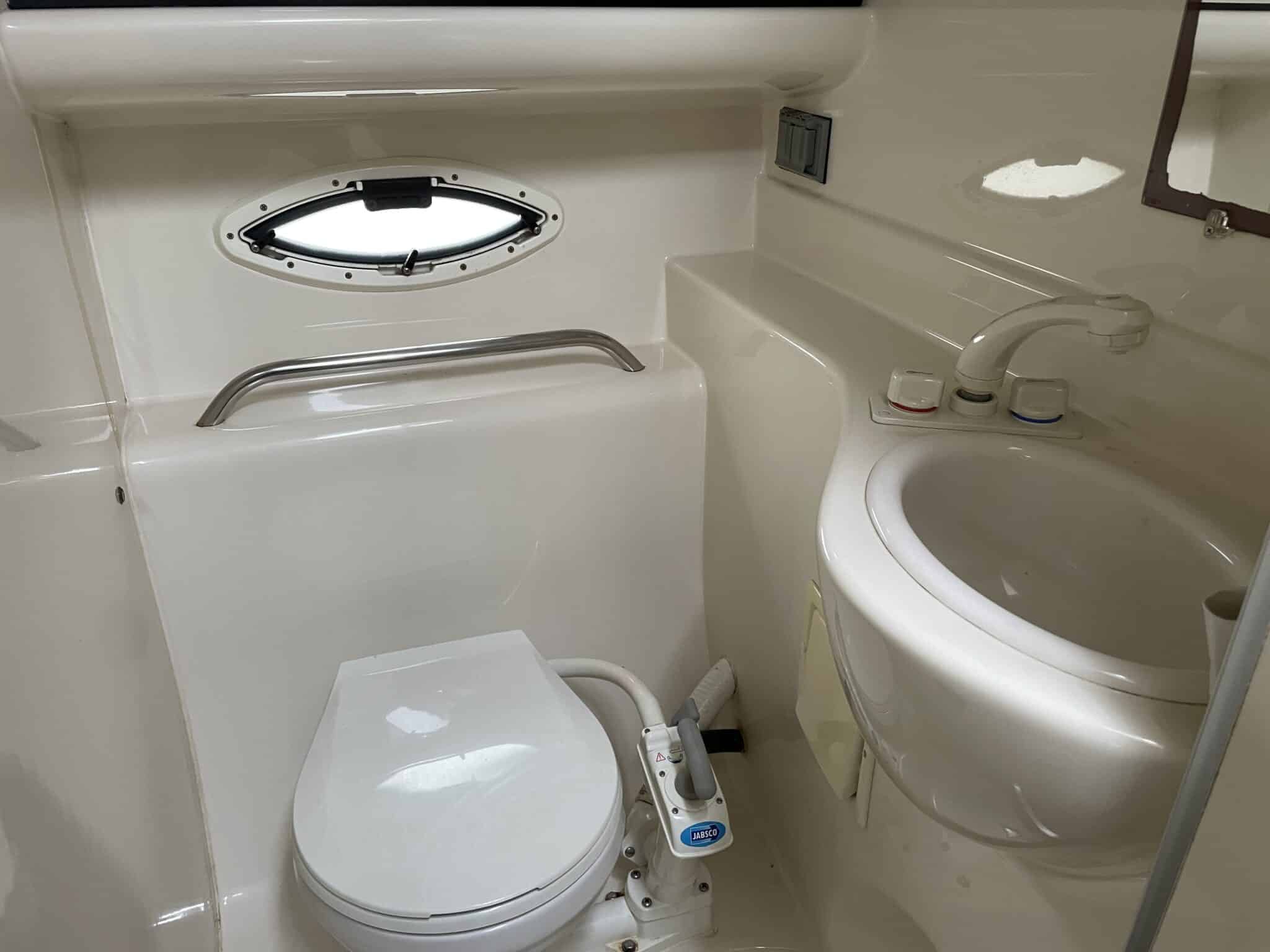 Indgang til separat Toilet rum med vask og skabe samt toilet koblet til Holdingtank – dækstømning.