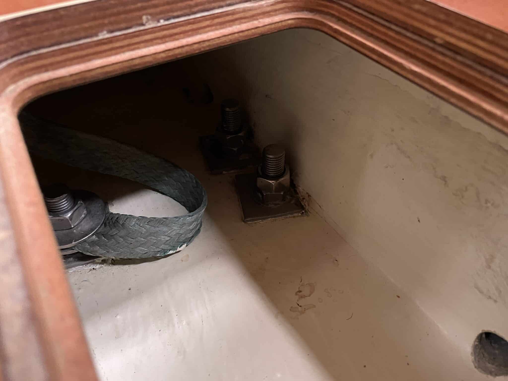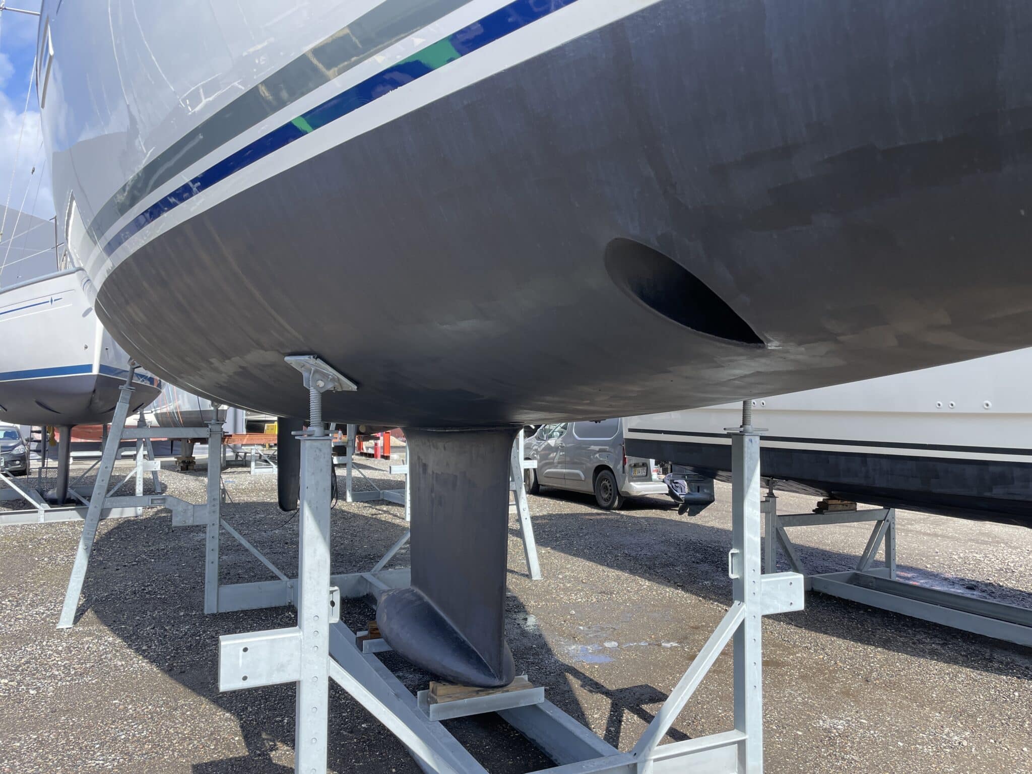 Båden står på land med mast, nye sejl monteres i løbet af foråret 2026. Bliver bundmalet af fagfolk.