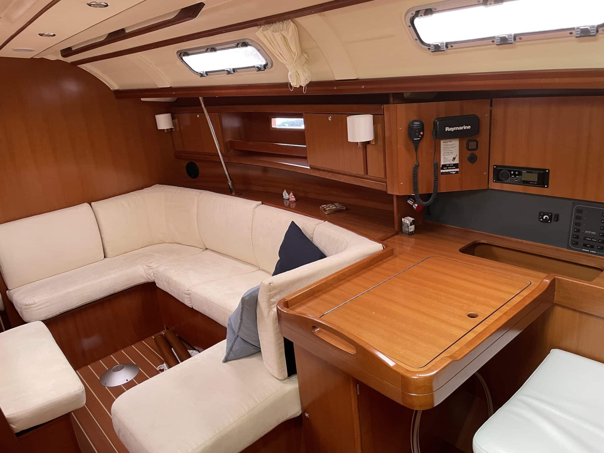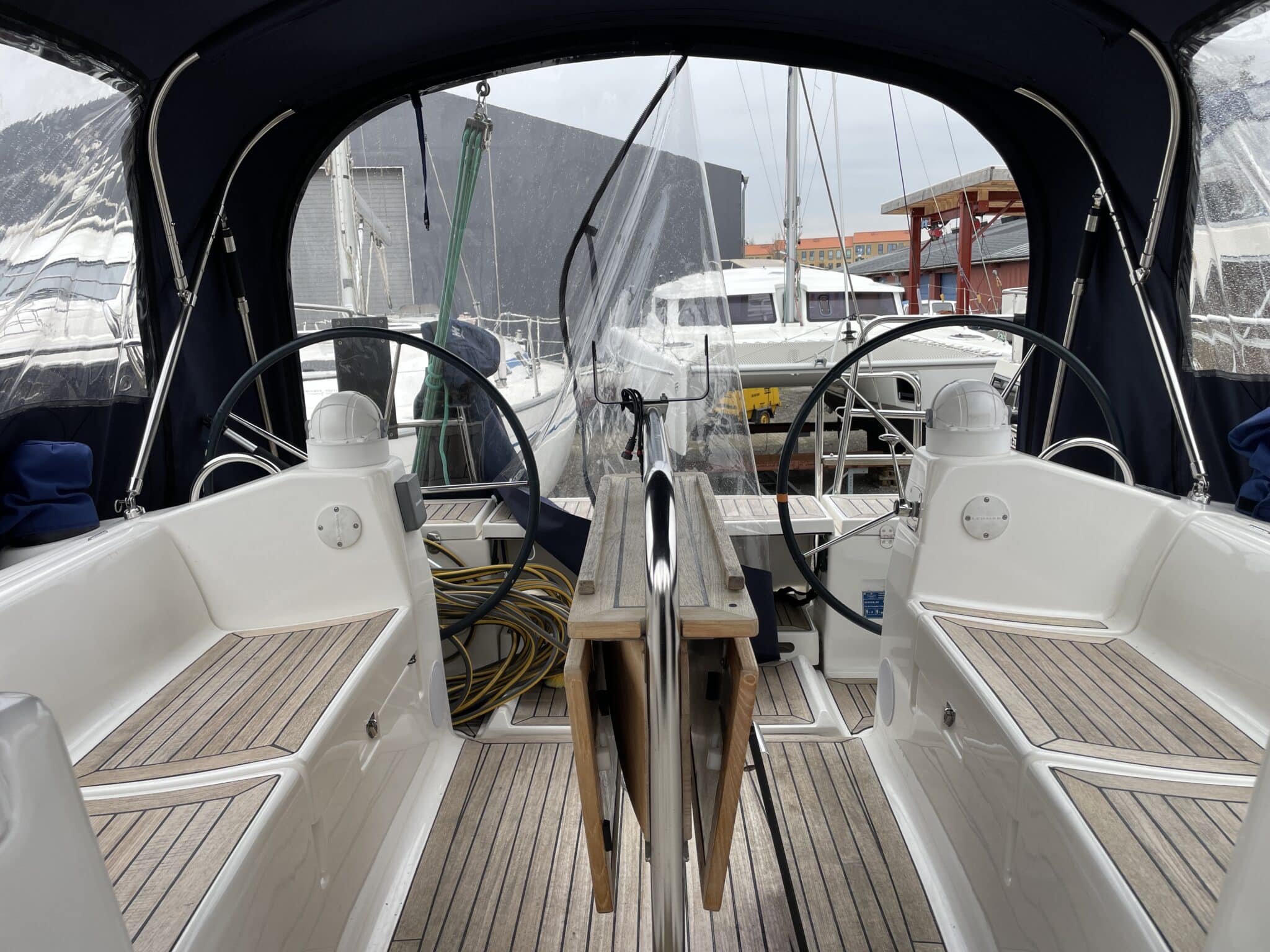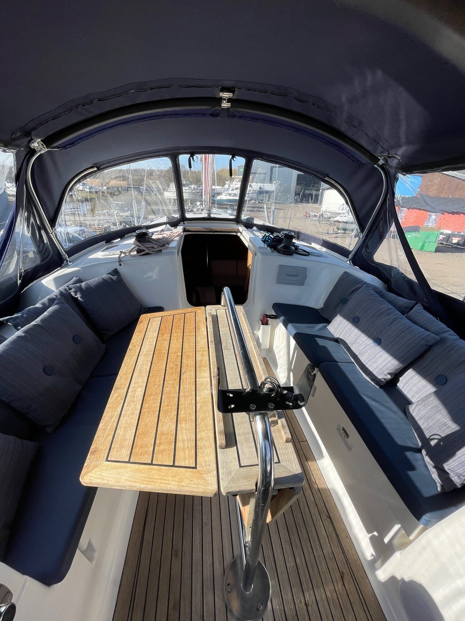 Du finder det store cockpit på denne Dufour 385 GL i hjertet af båden med:
