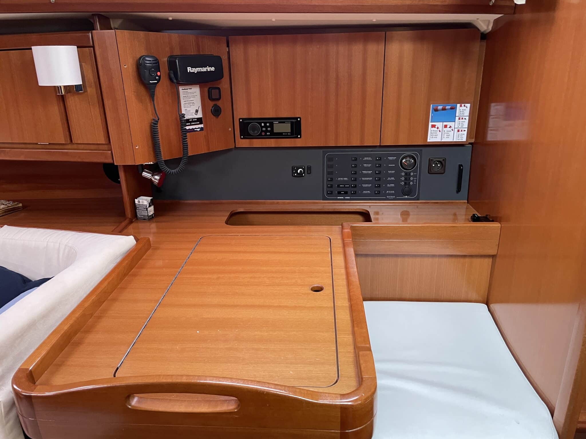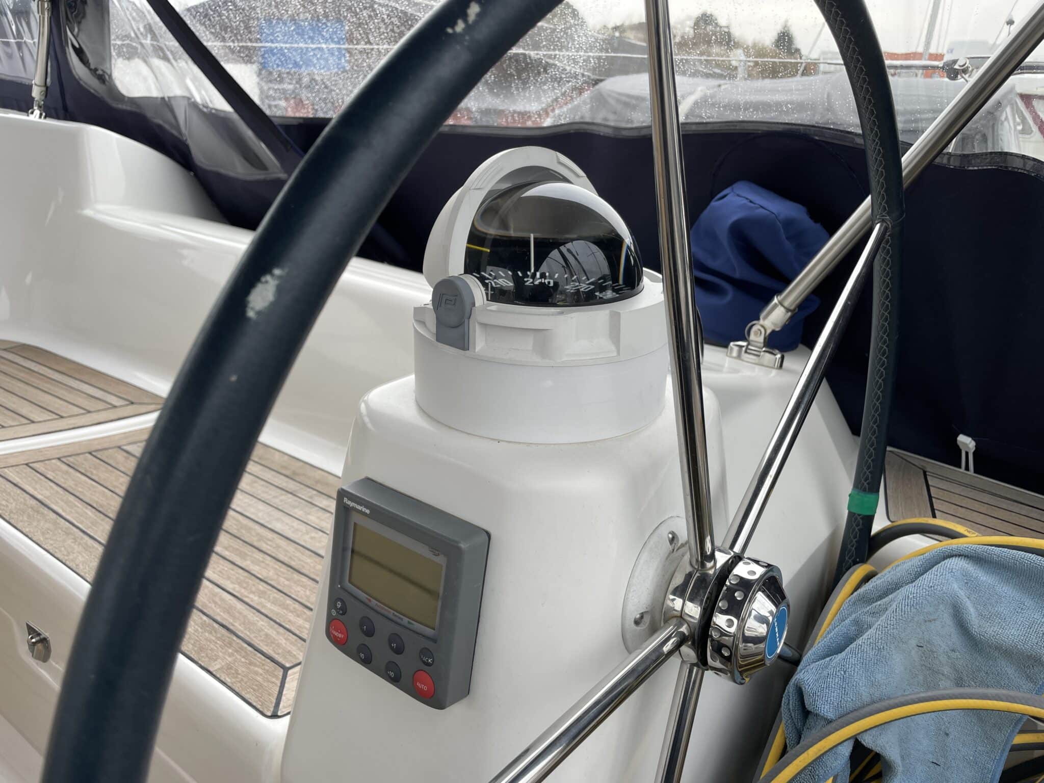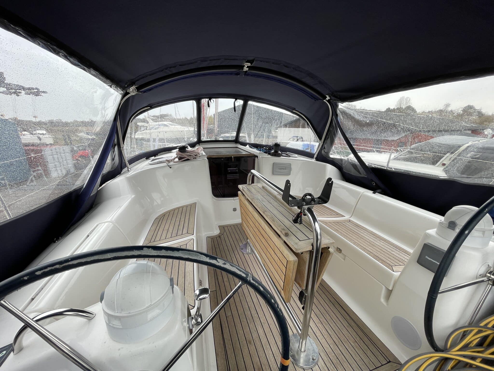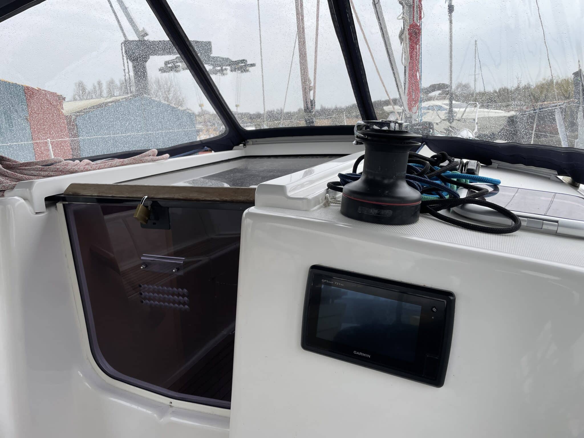 Du finder det store cockpit på denne Dufour 385 GL i hjertet af båden med: